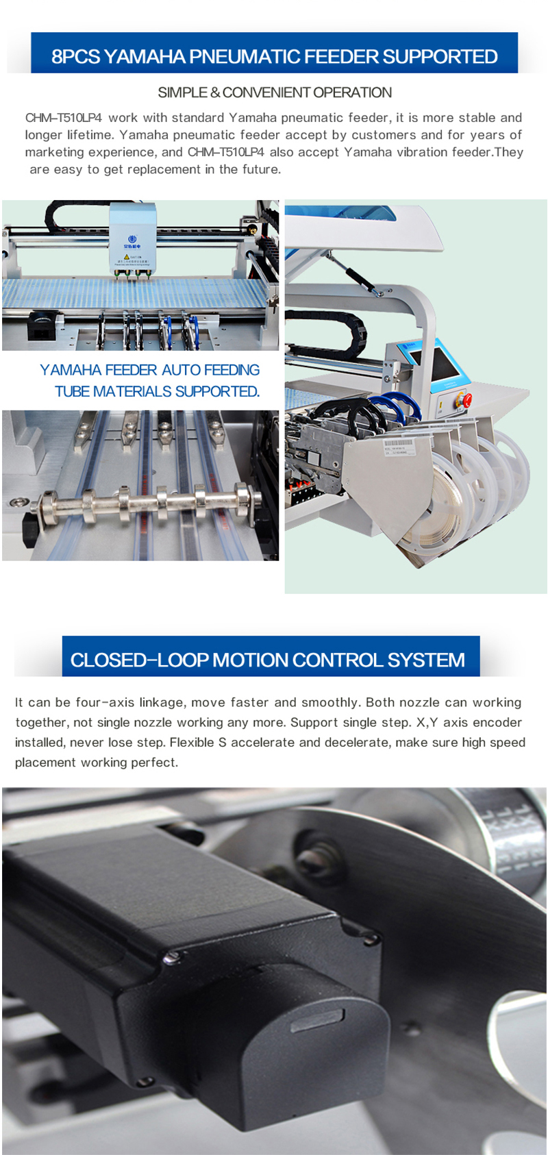 CHM-T510LP4 is an professional LED design pick and place machine. with 1.2M moving table, it has 4heads and 8pcs Yamaha feeders.